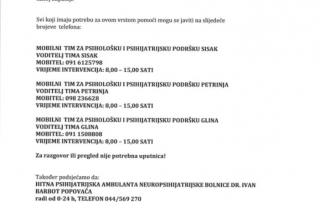 Obavijest o radu mobilnih timova za psihološku i psihijatrijsku podršku- nije potrebna uputnica- 0911508808.